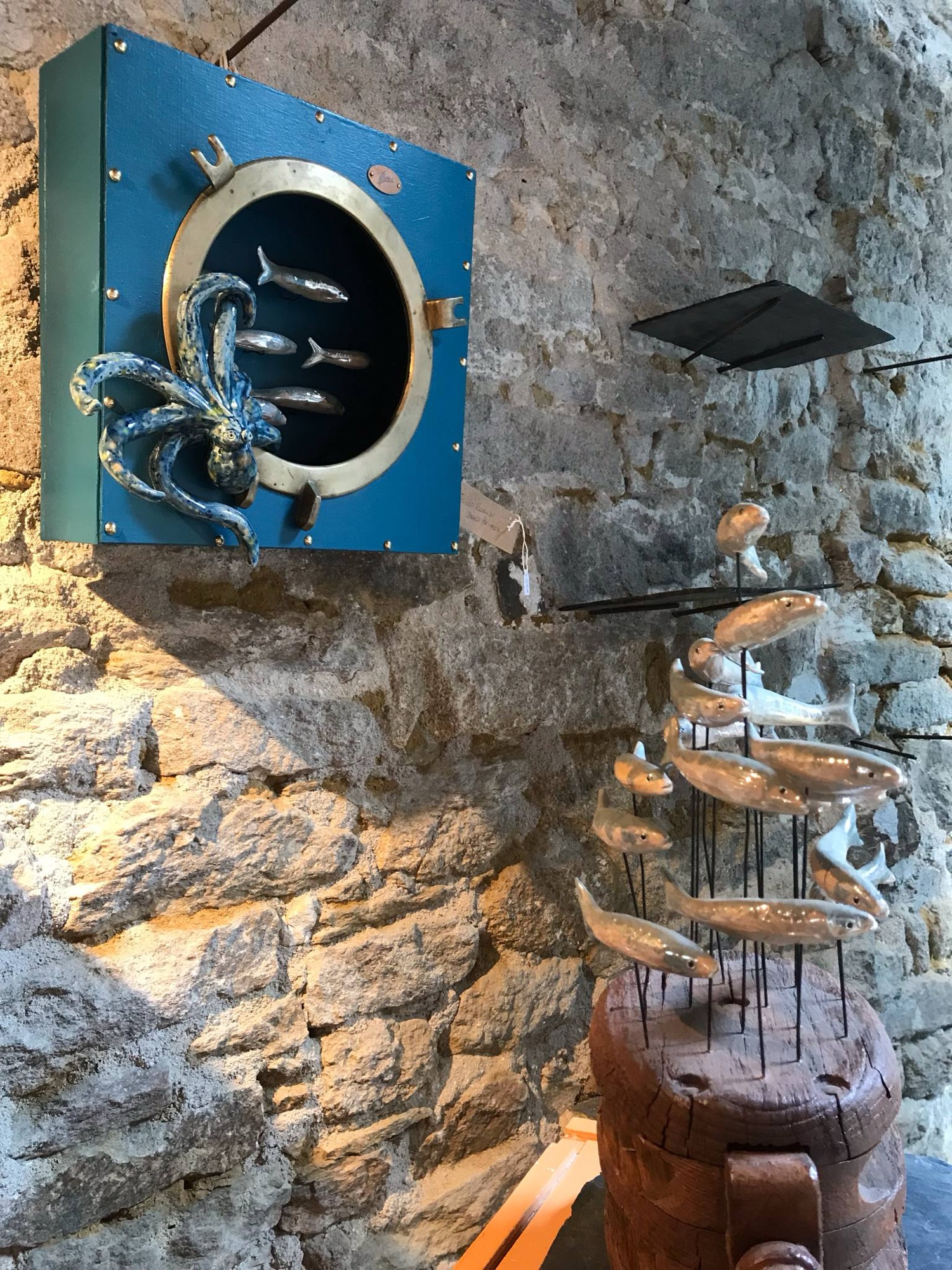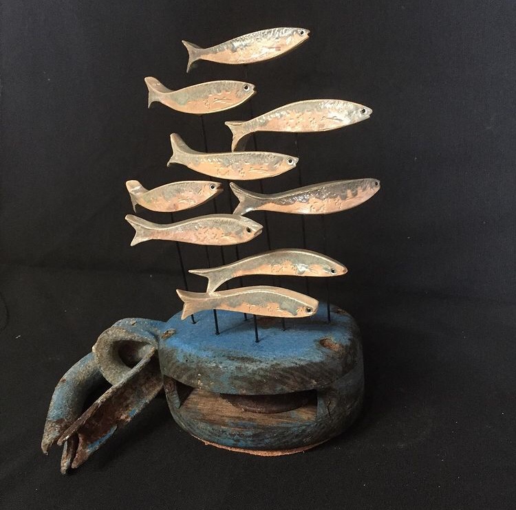 Tableau : sardines en céramique sur carte marine